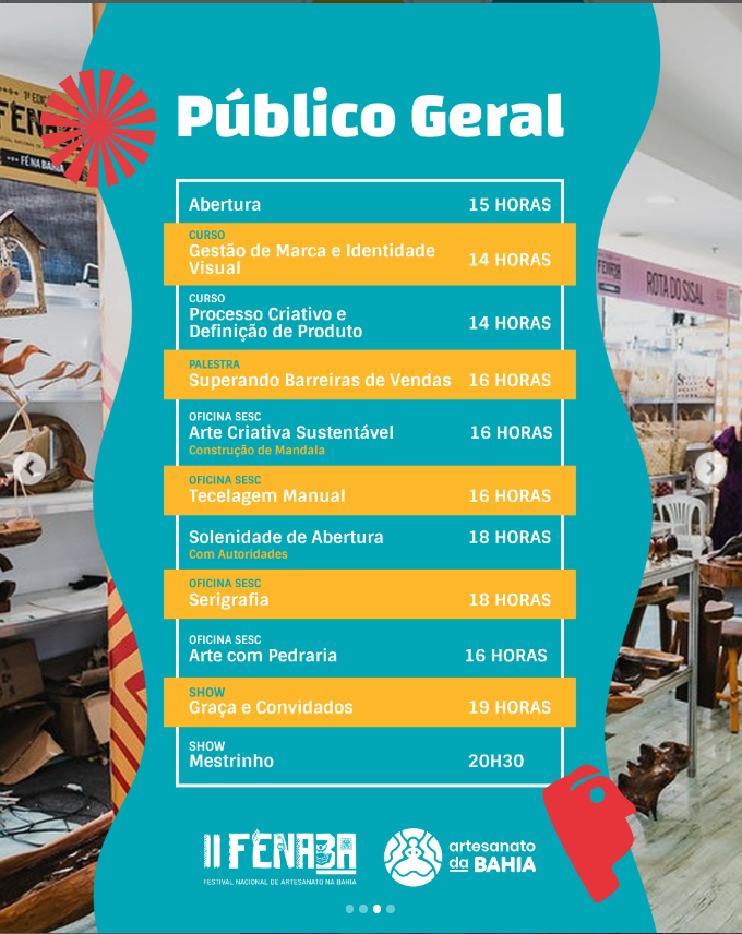 A programação musical promete animar o público com shows de Mestrinho, Olodum, Sued Nunes, Geraldo Azevedo e Filhos de Jorge, transformando a Arena Fonte Nova em um grande encontro entre arte, cultura e identidade nordestina. O Festival Nacional de Artesanato da Bahia é uma verdadeira celebração dos talentos e das raízes do povo nordestino — uma experiência que une tradição, inovação e coletividade em cada detalhe.