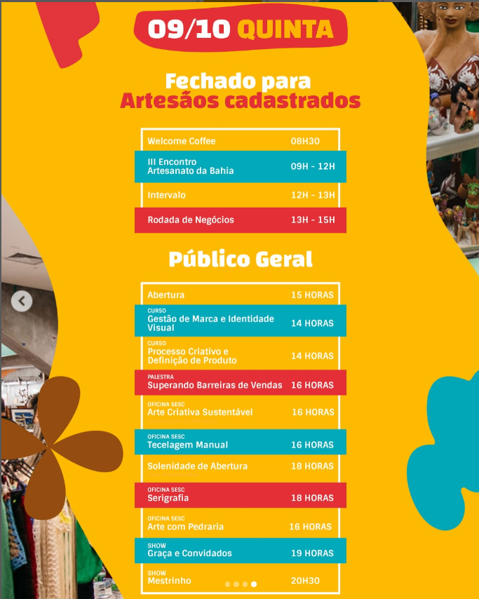 Entre os destaques da edição estão os Centros Públicos de Economia Solidária, que levam a representatividade da economia solidária e da produção regional ao público baiano e turistas de todo o país. Nesta edição, eles contam com um espaço especial na Arena Fonte Nova, onde o público pode conhecer de perto os grupos produtos e histórias que fortalecem o desenvolvimento local e a cultura baiana. O