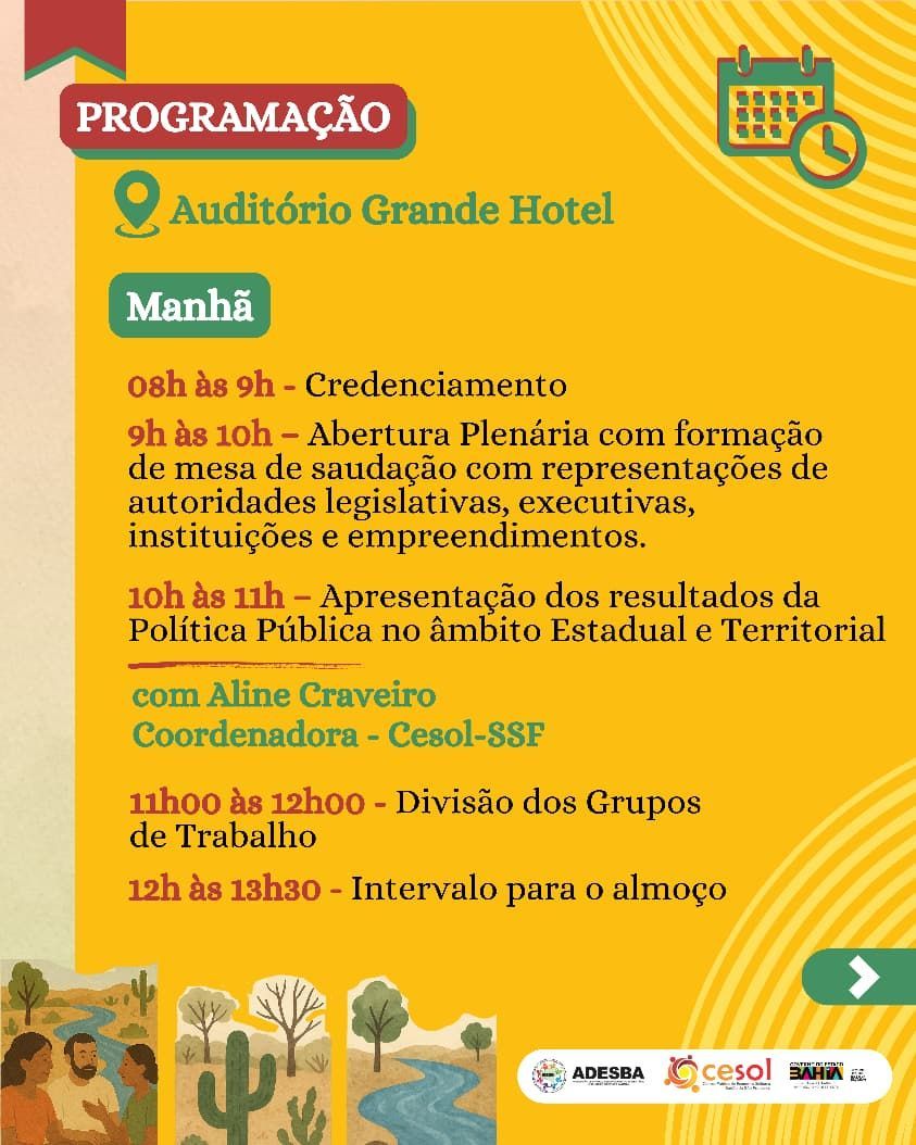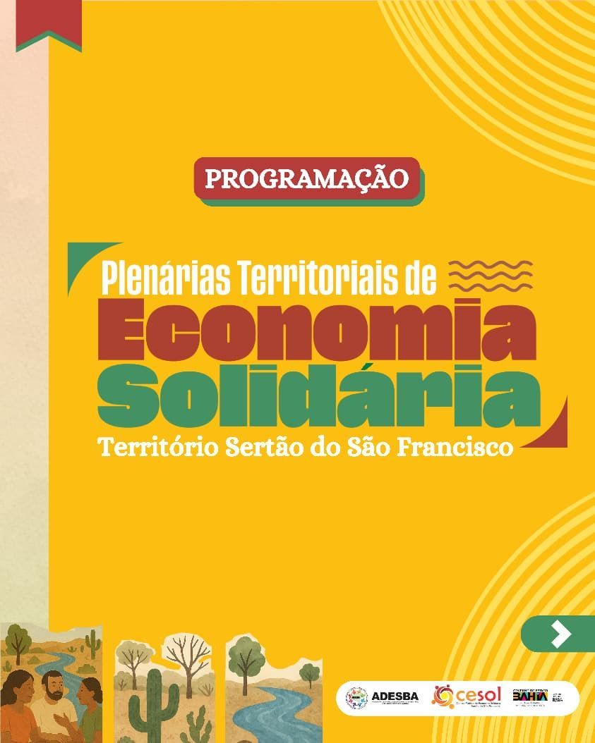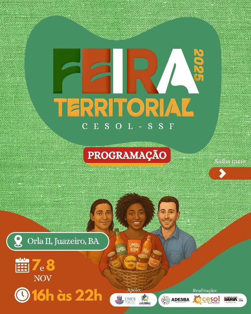 Entre os dias 06 e 08 de novembro, Juazeiro vai sediar a Plenária e Feira Territorial de Economia Solidária do Sertão do São Francisco — uma iniciativa do Cesol Sertão do São Francisco (Cesol-SSF), executado pela Associação de Apoio ao Desenvolvimento Sustentável e Solidário do Estado da Bahia (ADESBA). O evento tem como objetivo fortalecer o diálogo e a integração entre o poder público, os empreendimentos solidários e a sociedade civil.