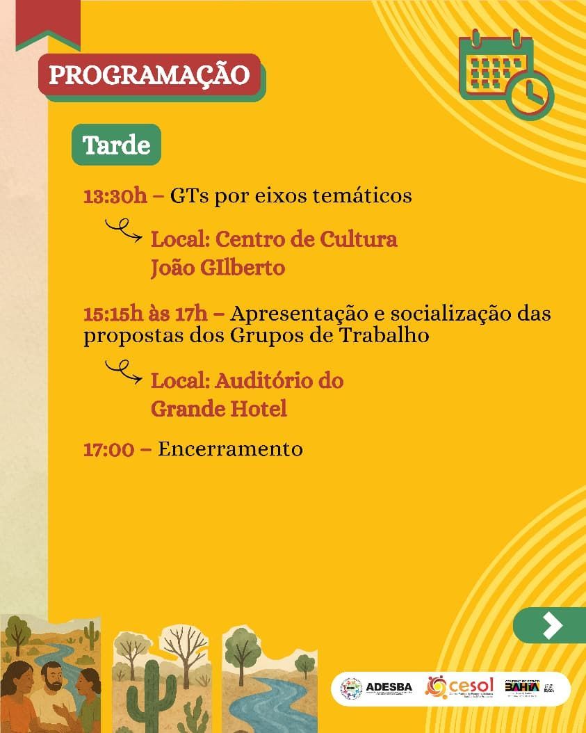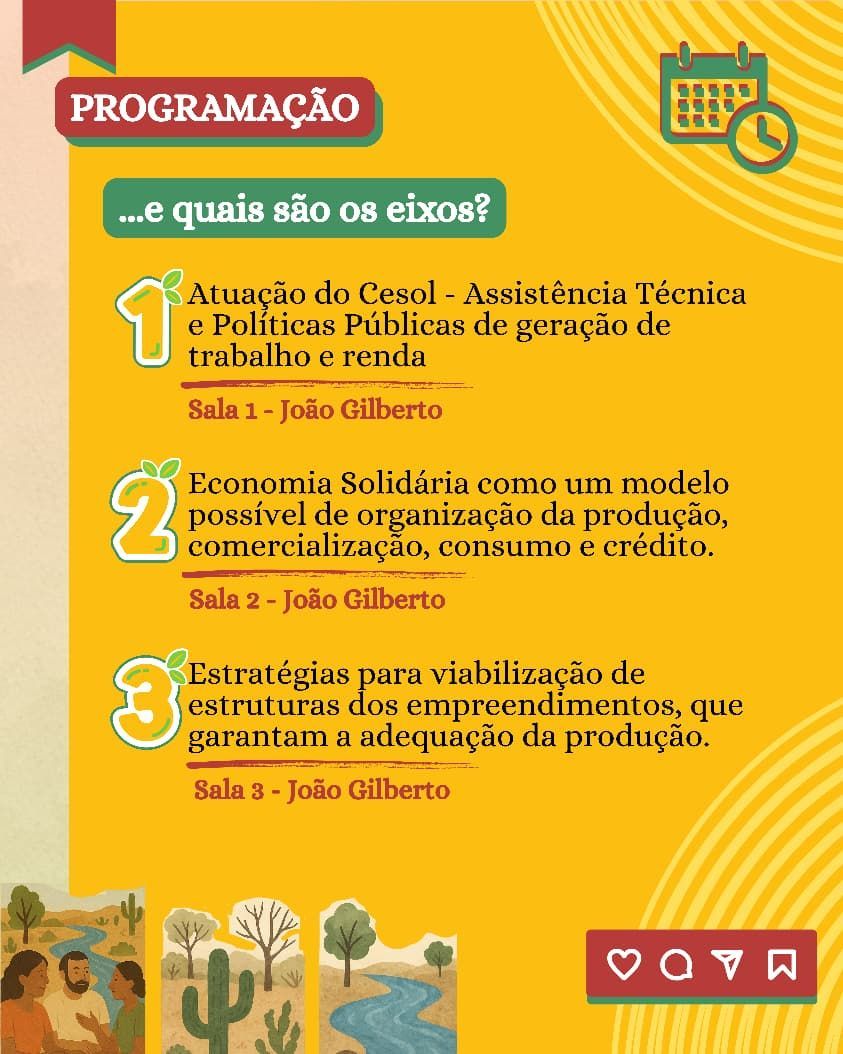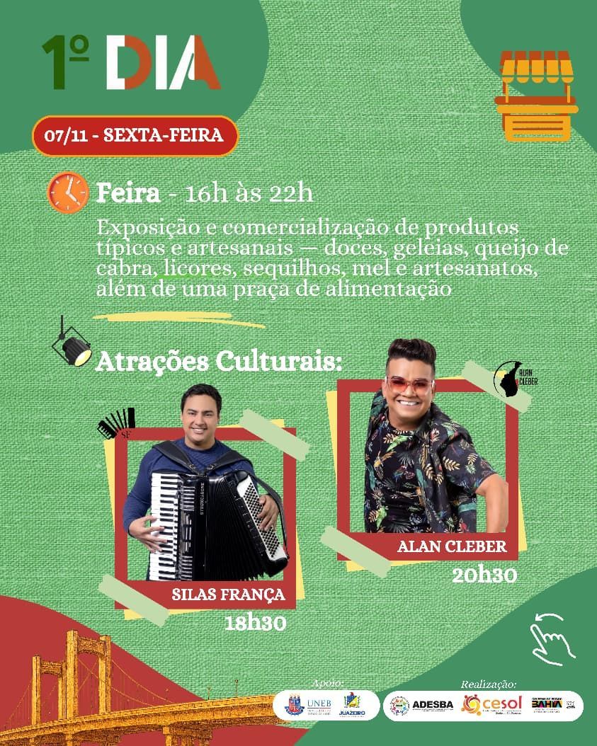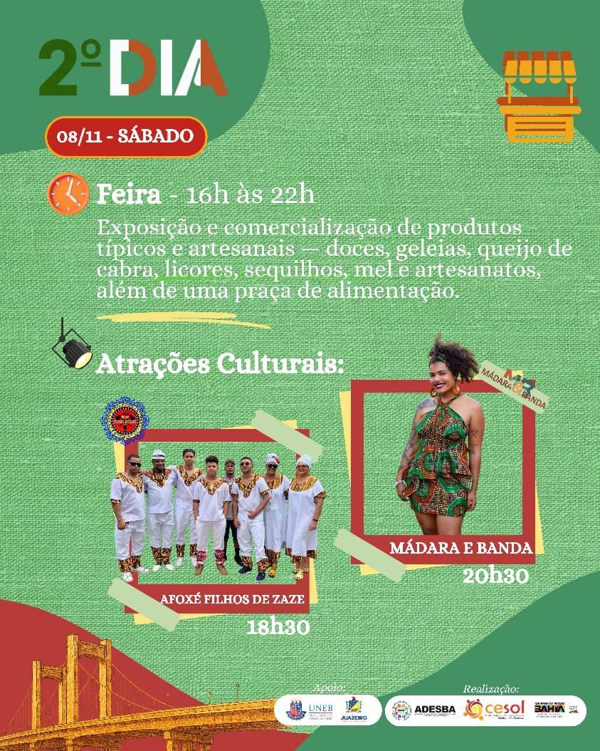 Nos dias 07 e 08 de novembro, a programação se estende para a Feira Territorial de Economia Solidária, que será realizada na Orla II de Juazeiro. A feira reunirá uma grande diversidade de empreendimentos e produtos — como doces, geleias, queijos de cabra, licores, sequilhos, mel e artesanato, refletindo a identidade e a força da economia solidária na região. Além das exposições, o evento contará com atrações culturais, apresentações musicais e uma praça de alimentação com comidas regionais e experiências gastronômicas.